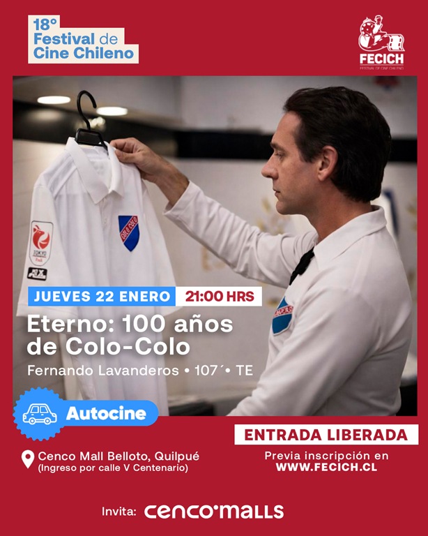 Como antesala de lo que serán las actividades del 18ª Festival del Cine Chileno FECICH, la organización del certamen junto a Cenco Mall, invitan a la comunidad de Quilpué y alrededores a disfrutar de una función especial con la proyección de Eterno: 100 años de Colo-Colo en autocine, bajo un formato inmersivo y familiar bajo las estrellas.