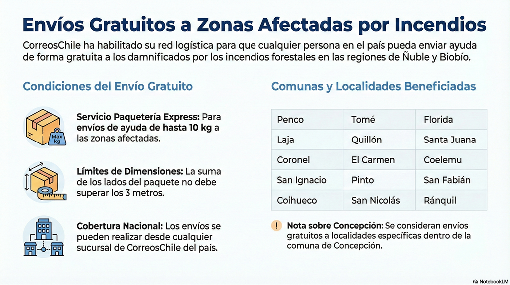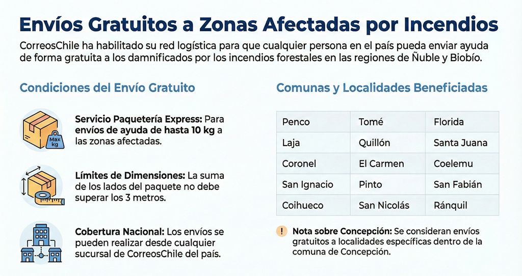 Con el objetivo de mantener conectadas a las personas afectadas por los incendios forestales en la zona sur del país, CorreosChile pone a disposición su red logística para que personas de todo el país puedan realizar envíos sin costo a las personas que residen en las comunas y localidades afectadas de las regiones de Ñuble y Biobío.